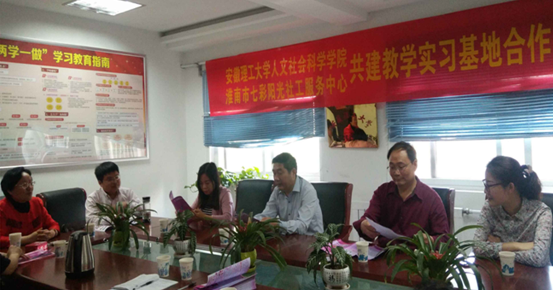 5月16日下午,微扑克 与淮南市七彩阳光社工服务中心共建教学实习基地合作座谈会在洞山街道中兴社区召开。参加座谈会的有市民政局副局长袁先进、社工科科长李娜,微扑克 党总支副书记、副院长吴云平,社会工作专业的部分教师、学生,七彩阳光社工服务中心主任夏荣军,社区负责人等。