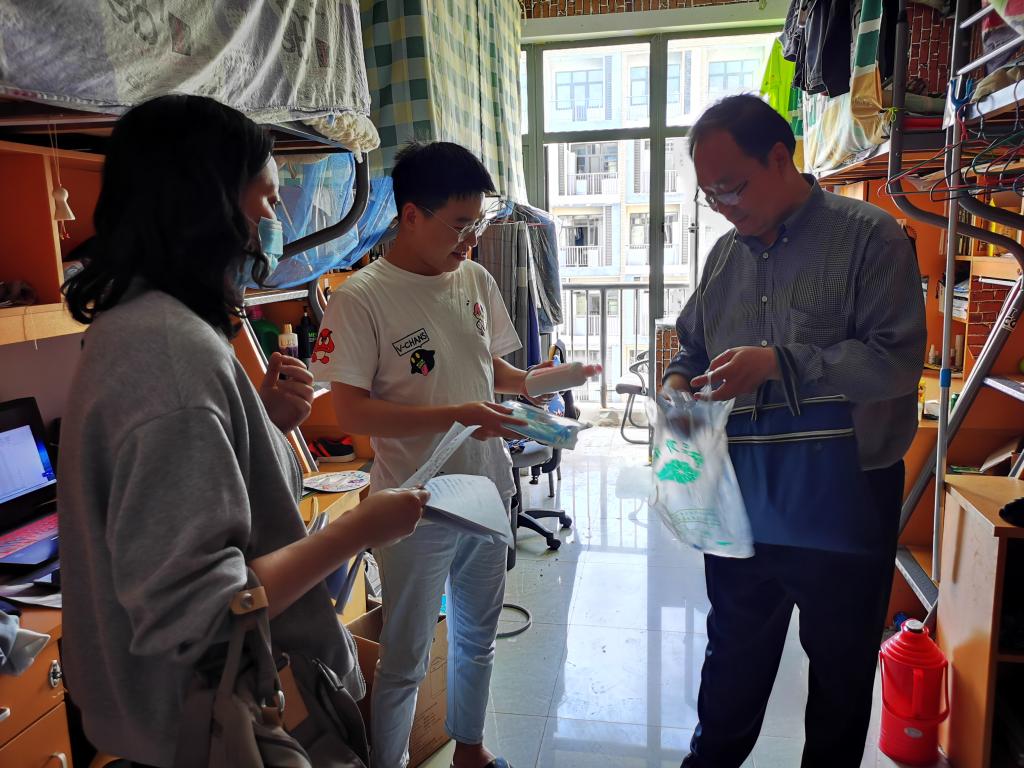 5月19日傍晚,微扑克 党总支书记吴云平带领微扑克 班子人员、辅导员深入学生寝室,看望返校的本科毕业班学生,给每个返校学生送上“防疫防护爱心包”,包里有口罩、洗手液、消毒液和体温计等防护物品。