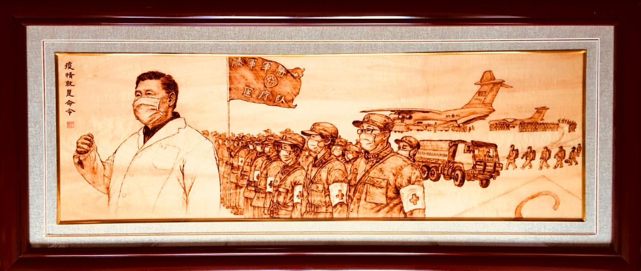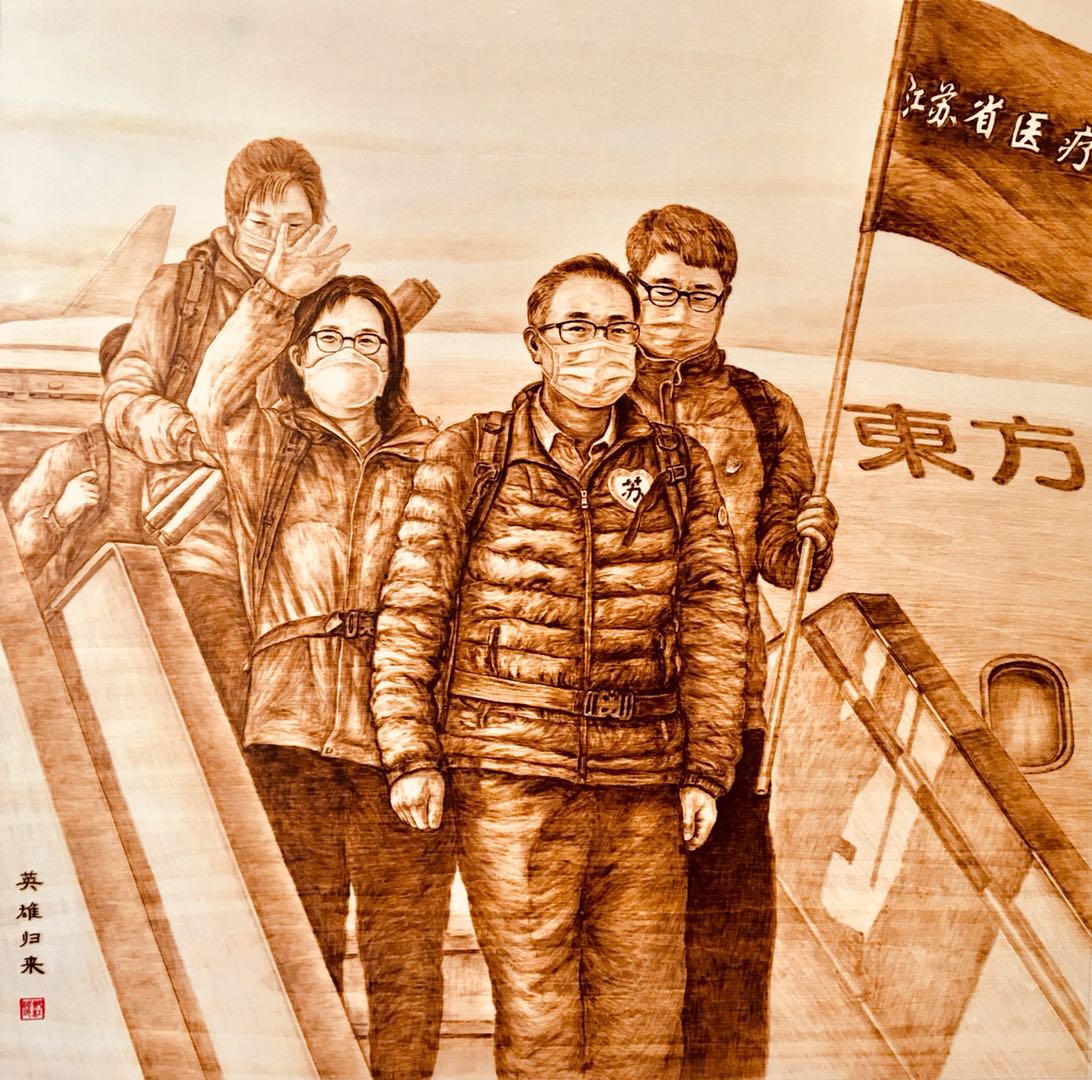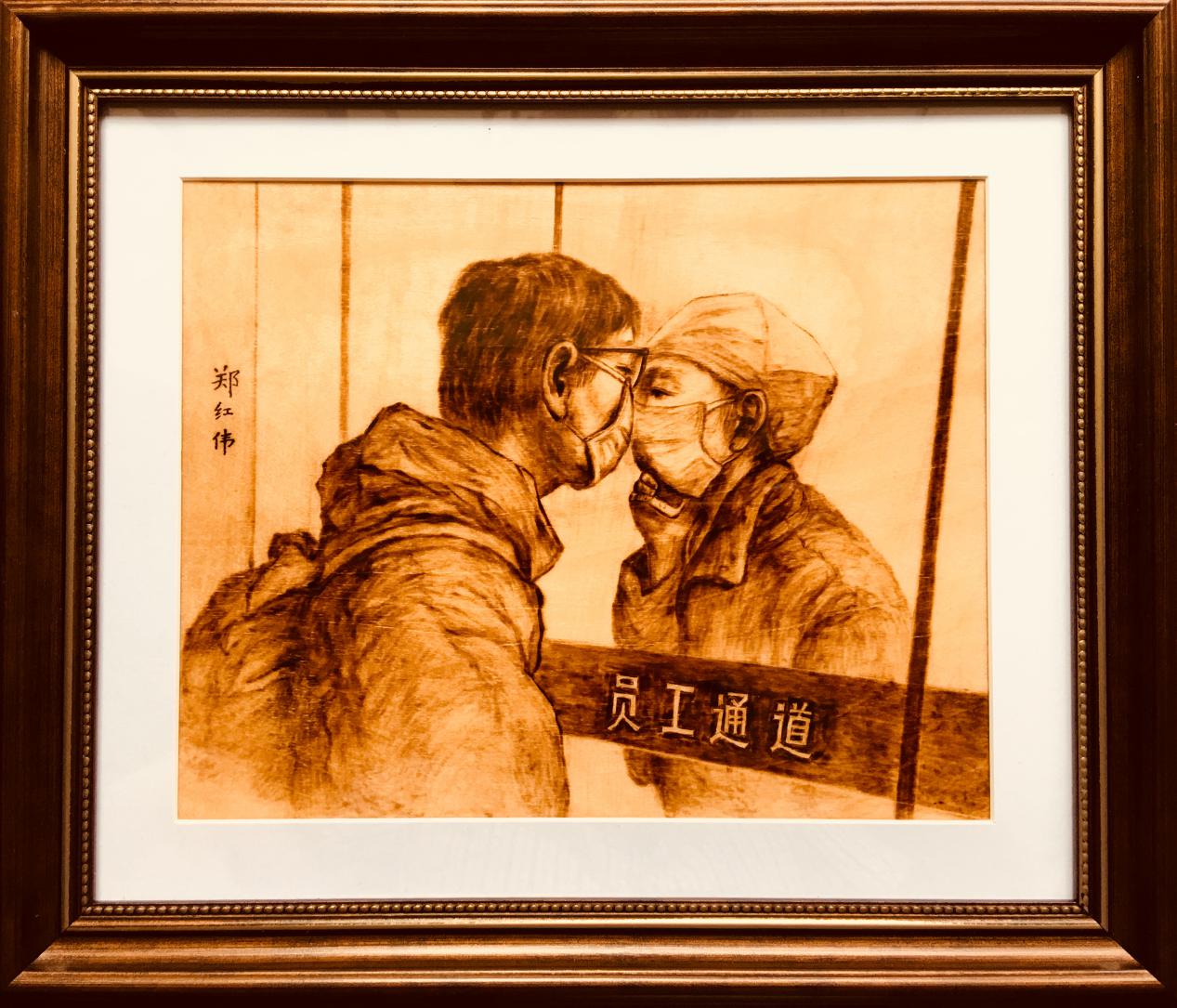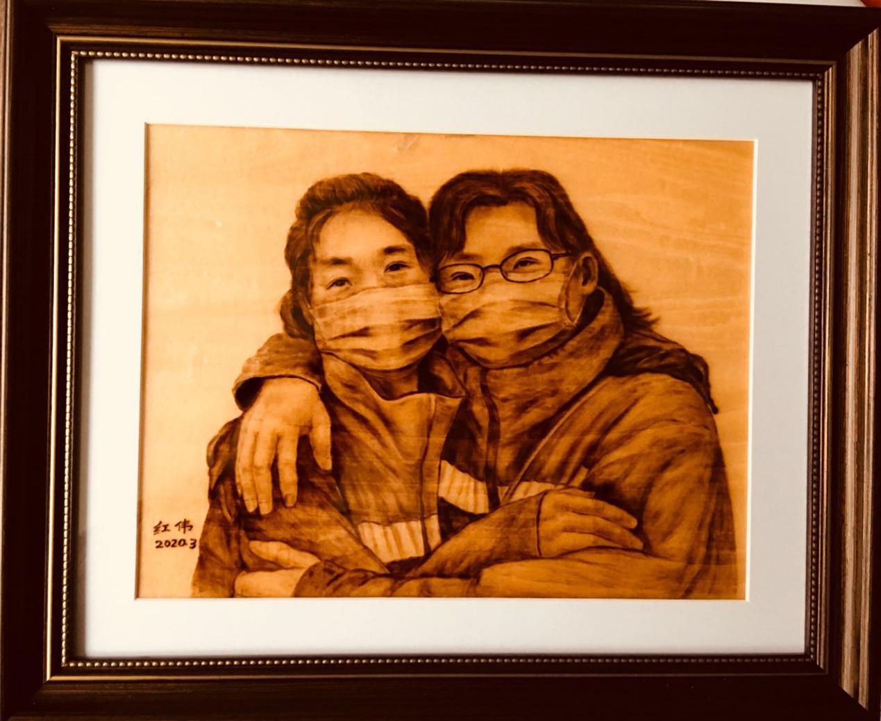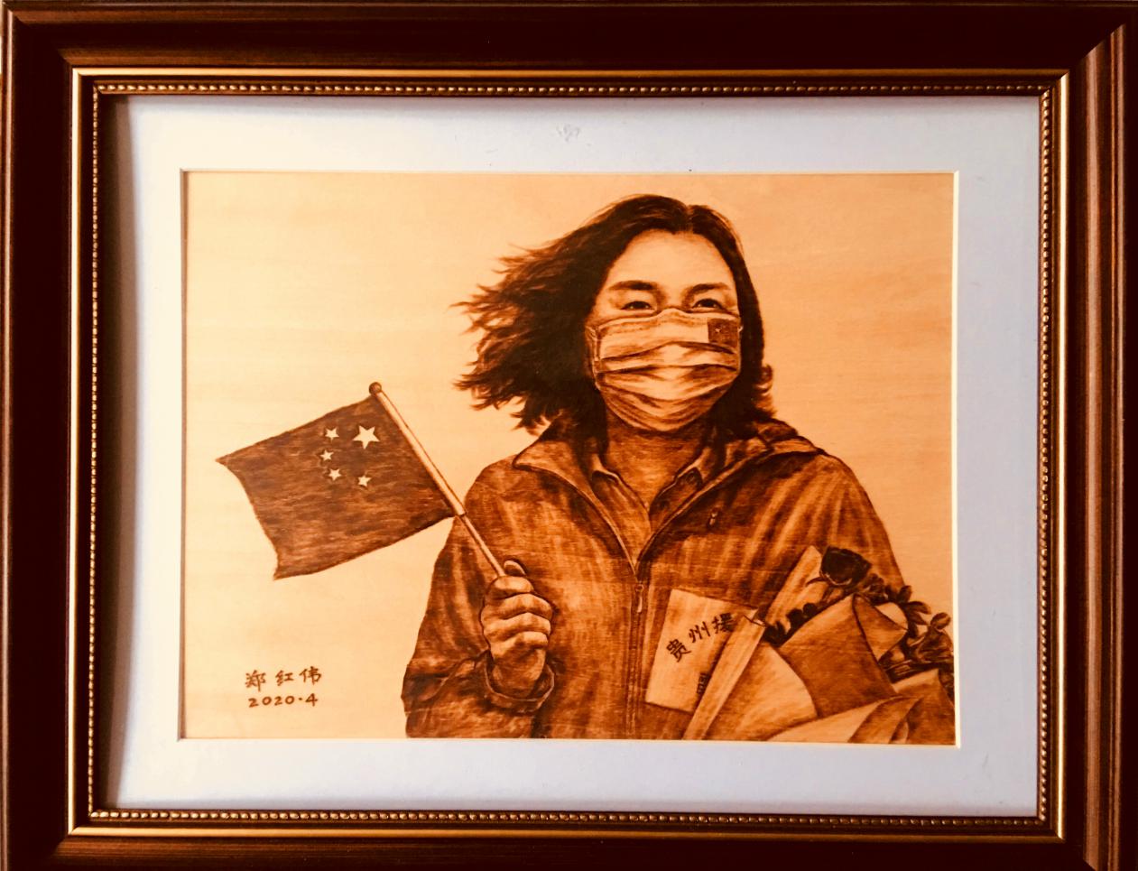 从2月份居家隔离至今,郑红伟每天工作十多个小时搜集抗疫人物素材,并且用烙铁完成创作。他说:“作为一名艺术工作者,有责任和担当去记录当下,铭记历史,把新时代的英雄故事以作品的形式流传下去,把中国人的仁济天下的胸怀、中国人的大爱无疆的精神弘扬下去。当前世界疫情形势严峻,我会继续关注世界人民抗疫战斗,不断创作出作品。”