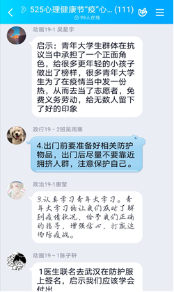 活动开展以来,微扑克 心理辅导站(心联部)举办了“疫”心说活动。该活动以QQ群为交流渠道,每日发布讨论问题,引导同学们思考探索解决有关抗疫和心理健康方面的问题。活动期间,同学们踊跃发表见解,“我们会及时了解疫情情况,听从学校安排,好好学习,调整心态”“我们要保持自信、相信国家政府、相信前线的医护,不信谣、不传谣”……