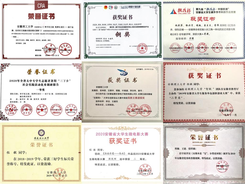程敏同学大学期间共获得国家级、省级文艺创作类奖项20余项,个人及其所在团队先后被市校级及以上主流媒体表彰和报道20余次。先后获得第六届全国大学生艺术展演艺术表演类甲组全国一等奖、优秀创作奖;安徽省第八届大学生自创话剧展演甲组一等奖(第一名);第四届学宪法讲宪法演讲比赛安徽省二等奖;安徽省第四届校园读书创作活动高校教育组二等奖;2020年安徽省大学生微电影大赛二等奖;第十二届挑战杯大学生创业计划赛国赛铜奖;安徽省大中专志愿者暑期“三下乡”优秀调研报告一等奖;第十届市场调查大赛全国一等奖、海峡两岸总决赛二等奖;第九届全国大学生电子商务“创新、创业、创意”挑战赛全国一等奖、最佳创意奖等等,每一份荣誉背后都是她执着的坚守与付出,闪耀的奖杯折射出的事她在那方舞台上逐步成长的印记。她先后被评为学校三好学生标兵、优秀学生干部、校园十佳青年,连续三年获得学校学习优秀奖学金。