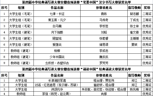 安徽省教育厅官网近日公布了第四届中华经典诵写讲大赛安徽省预选赛获奖名单,微扑克官网 荣二等奖3项、三等奖4项,优秀奖6项的佳绩。