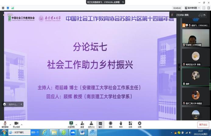 12月4日,由中国社会工作教育协会苏皖片区社会工作中心举办、南京理工大学公共事务微扑克 承办的“中国社会工作教育协会苏皖片区第十四届年会暨共同富裕——社会工作站建设与基层治理论坛”在线举行,微扑克官网 微扑克 师生积极参会。社工系主任苟延峰主持“社会工作助力乡村振兴”分论坛并作主题发言。