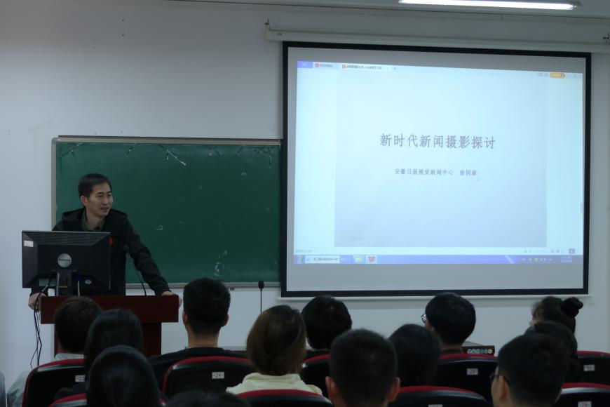 邀请安徽省摄影家协会副主席、安徽日报视觉微扑克副主任,高级记者、一级摄影师徐国康到崇智楼329报告厅作《新时代新闻摄影探讨》报告。徐国康通过大量的摄影作品进行比较,从“虚实对比、大小对比、明暗对比、冷暖对、动静对比、方向对比”等方面论证了“新闻摄影要主题鲜明、主体突出”;重点阐述了“如何做到构图新颖画面生动”。徐国康在报告中结合了自己工作多年的获奖作品,应用大量的成功案例进行讲解,把理论与实践相结合,既有理论高度,又有实践指导,为广大师生带来了一场精彩的学术盛宴。