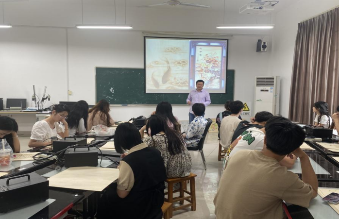 此次活动分理论讲座和烙画实践两个部分。在《烙画作品的形式美》讲座中,郑红伟结合具体作品阐述了烙画的一些常识、我国的烙画作品流派等,教授同学们如何欣赏优秀的烙画作品,如何在理解作品立意的基础上鉴赏作品的立体美、形式美,让学生对烙画有了新的感观认知。他还介绍了烙画的工具、材料,以及烙画制作的方法和工艺流程,让每个同学都熟悉了烙画制作工艺。在烙画实践教学环节,郑红伟亲自用烙铁带同学们创作烙画,讲解对烙铁运用力度和速度的掌控技巧、对温度和火候的把握,短短数分钟的时间,他娴熟地用烙铁烫出了一幅花鸟画作品,烙铁在他手里如有神助,可谓妙笔生花。同学们无不被他精湛的技艺所惊叹,太神奇了!