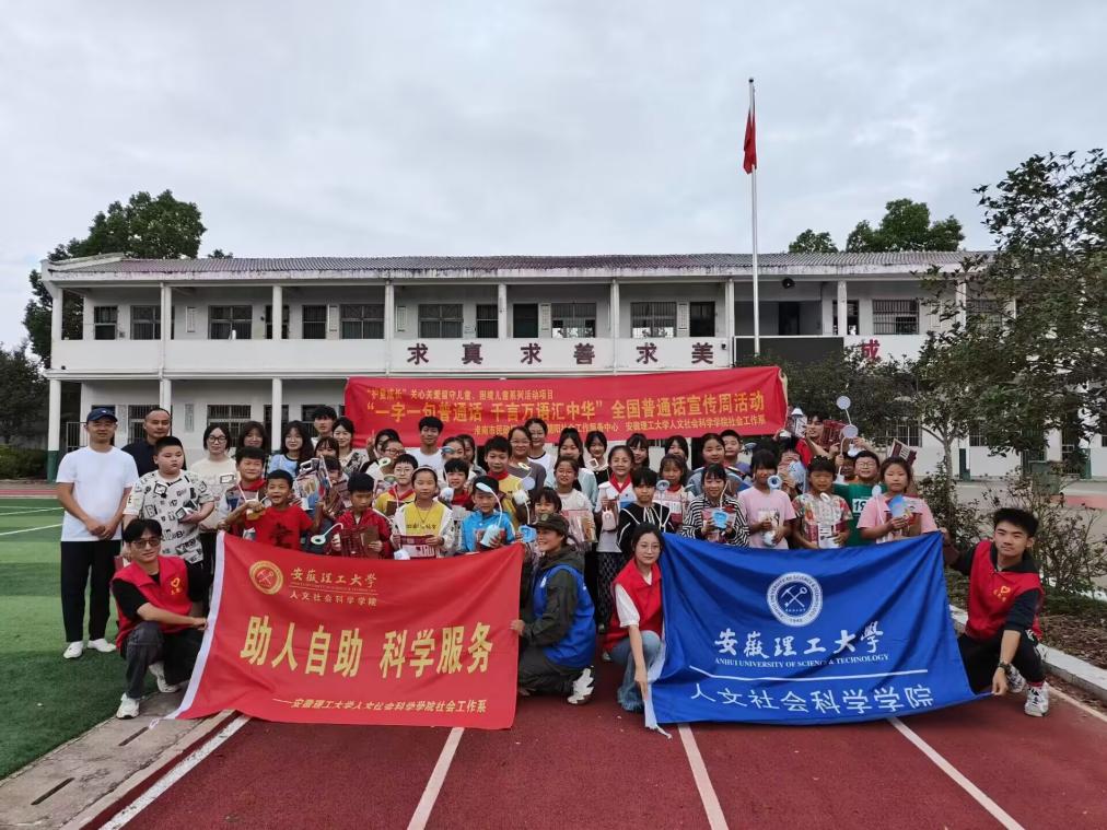 9月15日上午,微扑克 社会工作专业师生一行携手淮南市朝阳社会工作服务中心前往大通区吴大郢芝英希望小学,开展以“一字一句普通话 千言万语汇中华”为主题的普通话宣传推广活动。