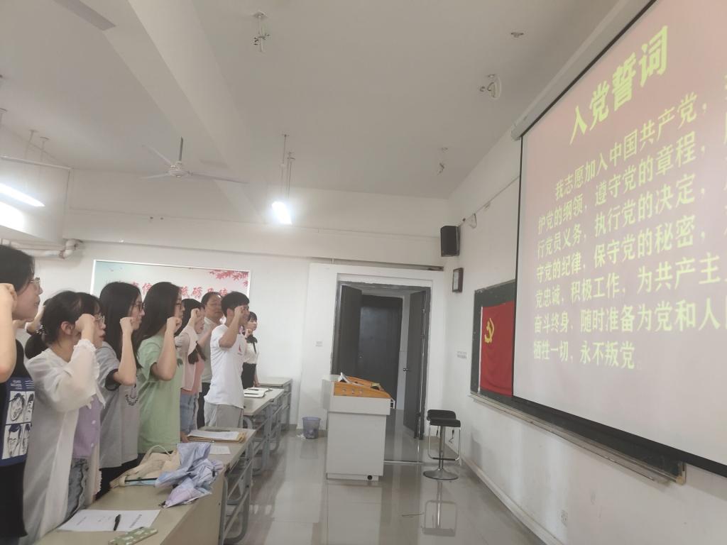 活动开始,由毕业班学生党员代表陈葛政领誓,全体新老党员面向鲜红的党旗庄严宣誓。张娜对毕业班学生党员提出殷切期望:第一,要坚定理想信念,坚持共产主义远大理想和中国特色社会主义共同理想,加强学习、实践,努力扣好人生的第一粒扣子。第二,要增强党员意识,时刻谨记党员身份,认真履行党员义务,正确行使党员权利,发挥先锋模范作用。第三,要强化纪律观念,时刻做到党规党纪记心中,无论是就业还是深造,都要做一个有担当的人,随时准备为党和人民牺牲一切。