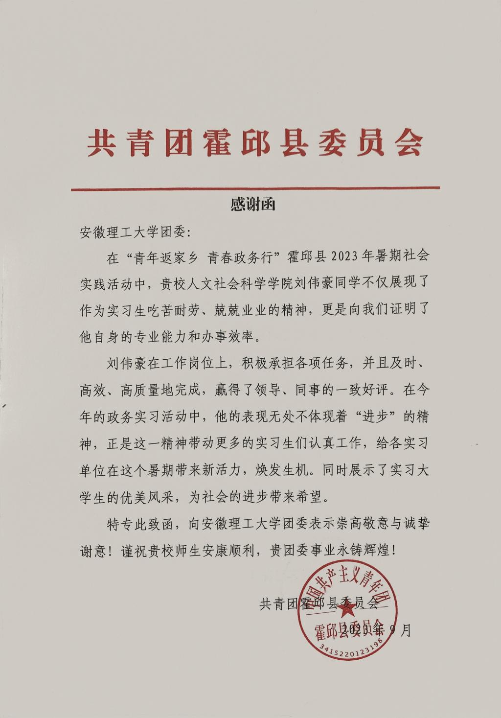 近日,微扑克官网 收到共青团霍邱县委员会发来的感谢函,表扬微扑克 网络与新媒体专业刘伟豪同学在“青年返家乡,青春政务行”霍邱县2023年暑期社会实践活动中展现了吃苦耐劳、兢兢业业的精神。