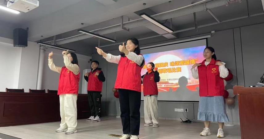 中场环节,社工志愿者带领全场同跳动感欢快的鸭子舞,并声情并茂地介绍每首歌曲的寓意。青少年们还依次上台献唱红歌《我和我的祖国》《我爱北京天安门》《我们和祖国最亲亲》等,时而婉转悠扬、时而激昂热烈,浓浓的爱国情深深地感染着在场的每个孩子。