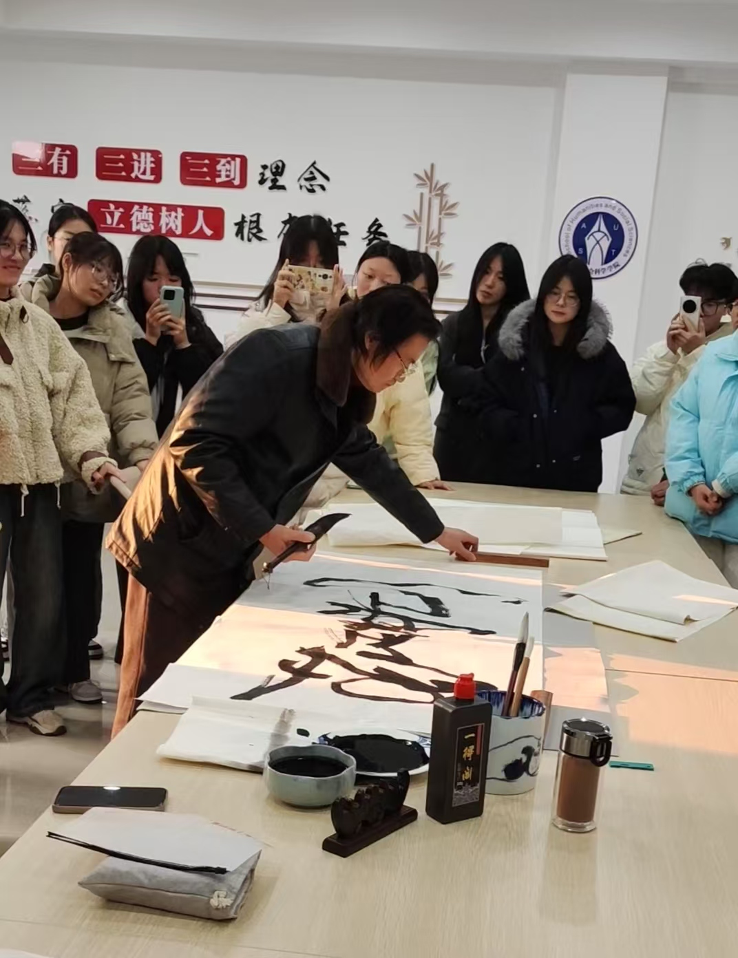 杨建立老师首先结合唐代草书大家怀素的生活和艺术创作从理论方面讨论了中国草书艺术发展的历程,并就艺术家的生活态度和创意精神与同学们进行了交流。随后,杨建立老师进行指纹画创作演示。杨老师即兴挥毫,现场书写了三幅大草作品:《知不足》《知生有涯》和《惟有读书高》;以指代笔,创作了指墨画《奔马图》。杨老师的书画创作令同学叹为观止。