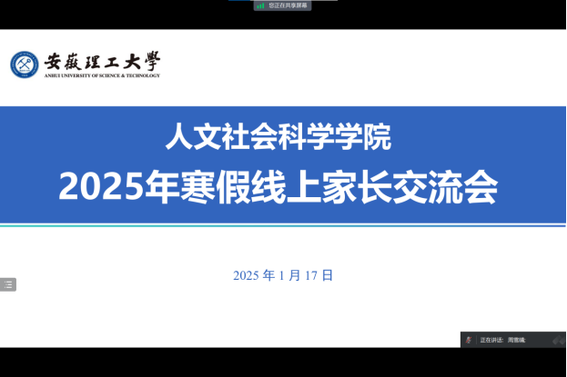 1月17日晚,微扑克 召开2025年寒假线上家长交流会。微扑克 党政领导班子、本科生辅导员以及近300位家长参加了会议。家长会由微扑克 党委副书记周雪晴主持。