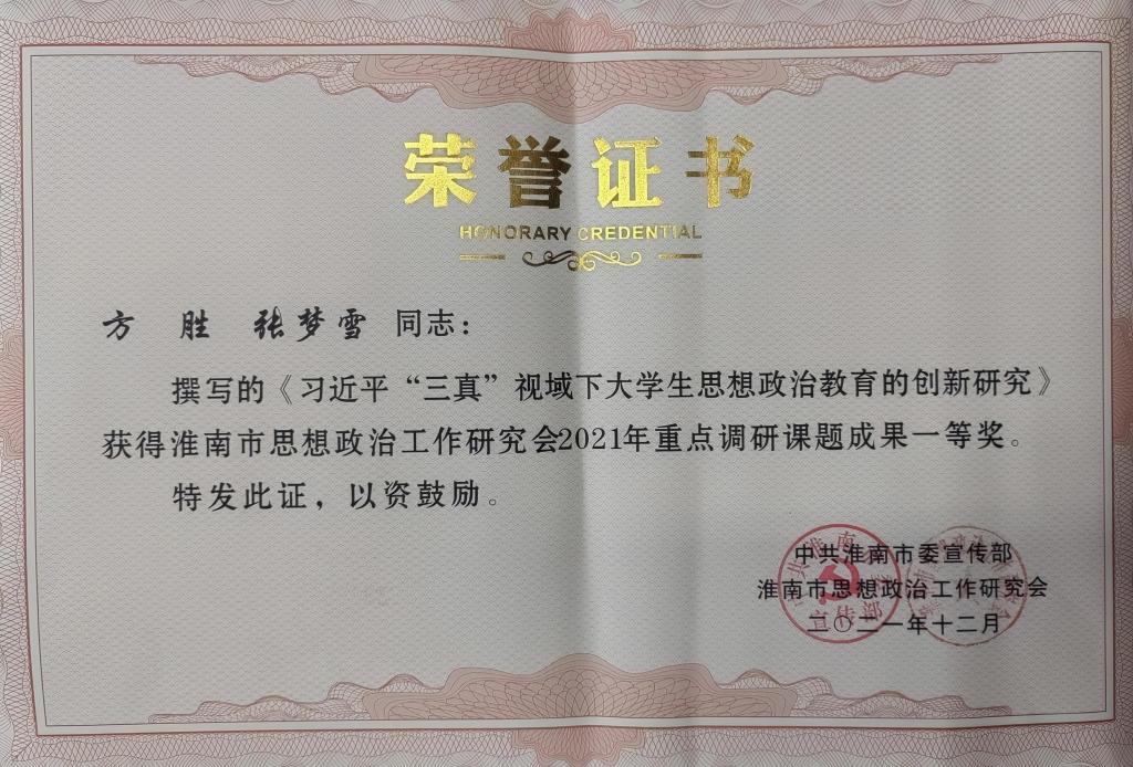 近日,淮南市委宣传部、淮南市思想政治工作研究会公布2021年重点调研课题成果奖励名单,微扑克官网 微扑克 方胜教授带领政治学与行政学专业2020级本科生张梦雪完成的《习近平“三真”视域下大学生思想政治教育的创新研究》获得一等奖。